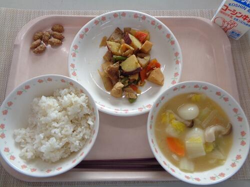 牛乳 ごはん さつまいもの筑前煮 もちみそぞうに 黒糖アーモンド