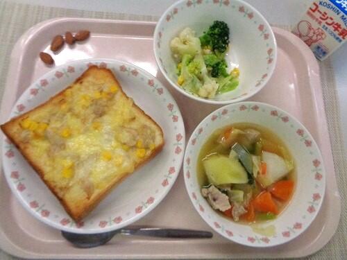 牛乳 ツナトースト 花野菜サラダ ポトフ アーモンド
