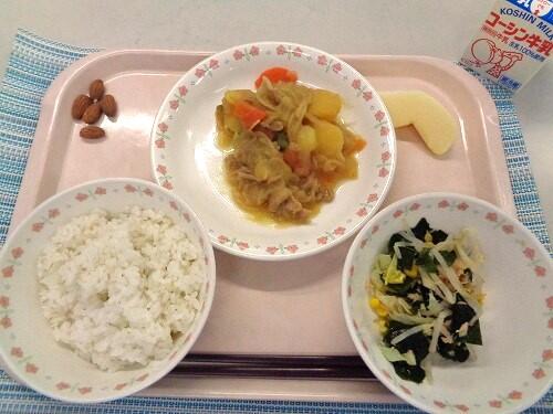 牛乳 ごはん 肉じゃが ツナとわかめの和え物 りんご アーモンド