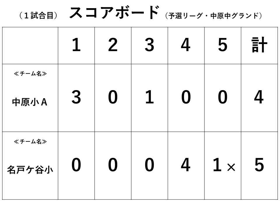 1試合目は「中原小Aチーム」と対戦。序盤、相手チームに3点を奪われ、劣勢の展開。しかし、昨年に続き逆転の名戸ケ谷小チームは健在。最後は試合をひっくり返し、5対4で勝利!(R071103スコアボード結果(予選リーグ・VS中原小Aチーム).jpg)