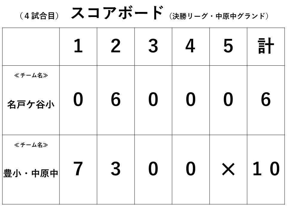 午後は決勝リーグ。午後の1試合目は「豊小・中原中チーム」と対戦。このチームは昨年の優勝チームでかなりの強豪チーム。1回裏から7点取られ一方的な試合展開になるかと思いきや、2回表に6点取り返し、逆転に望みをつなぐも…やはり強かった。結果は6対10で敗戦。(R071103スコアボード結果(決勝リーグ・VS豊小・中原中チーム).jpg)