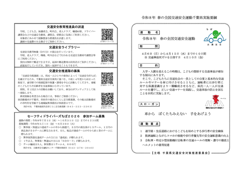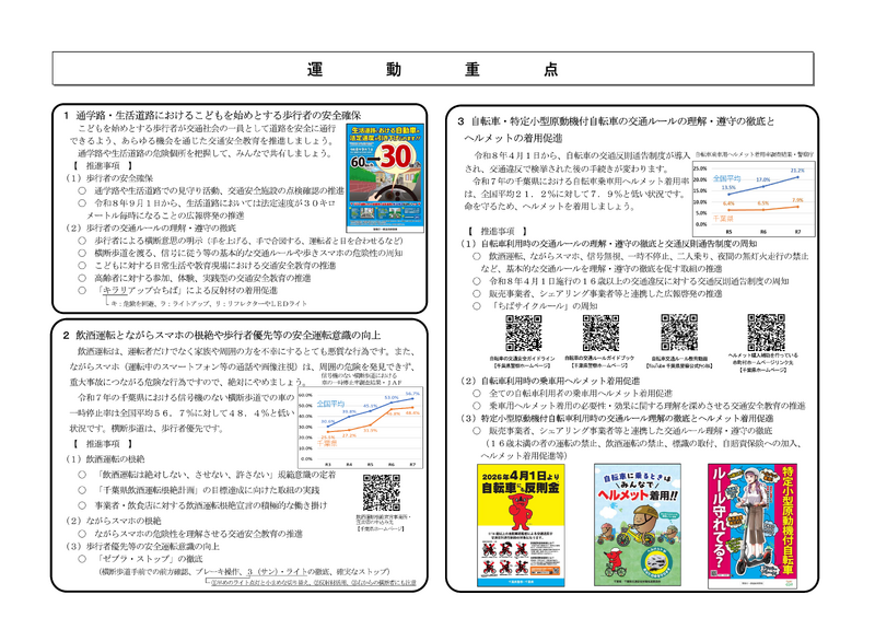 4月6日(月)から4月15日(水)までの10日間 ,令和8年『春の全国交通安全運動』が実施されています。今回は,「歩行者の交通ルールの理解・遵守の徹底」や「自転車利用時の交通ルールの理解・遵守の徹底」,「自転車利用時の乗車用ヘルメット着用促進」などが重点になっています。