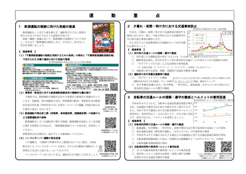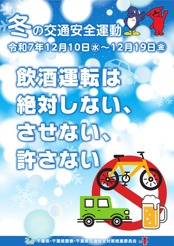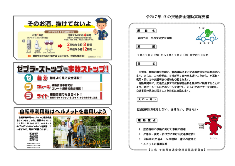 来週の12月10日(水曜日)から12月19日(金曜日)までの10日間,令和7年『冬の交通安全運動』が実施されます。今回は,「飲酒運転の根絶に向けた取組の推進」や「夕暮れ・夜間・明け方における交通事故防止」,「自転車の交通ルールの理解・遵守の徹底とヘルメットの着用促進」などが重点になっています。