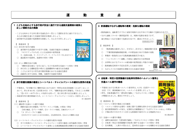 そこで,こどもたちに交通社会の一員としての自覚と基本的な交通ルールやマナーを身に付けさせるとともに,運転者には歩行者に対する保護意識をより一層醸成させるなど,県民一人一人が交通ルールを遵守し,正しい交通マナーを実践し,交通事故の防止を図ることを目的に実施します。