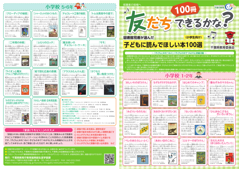 千葉県内の図書館司書の方が,子どもたちや御家族の方にぜひおすすめしたい本として選んだ100冊の本です。9月に小学校1年生の保護者を対象に,この「子どもの読書活動啓発リーフレット」を配付いたします。