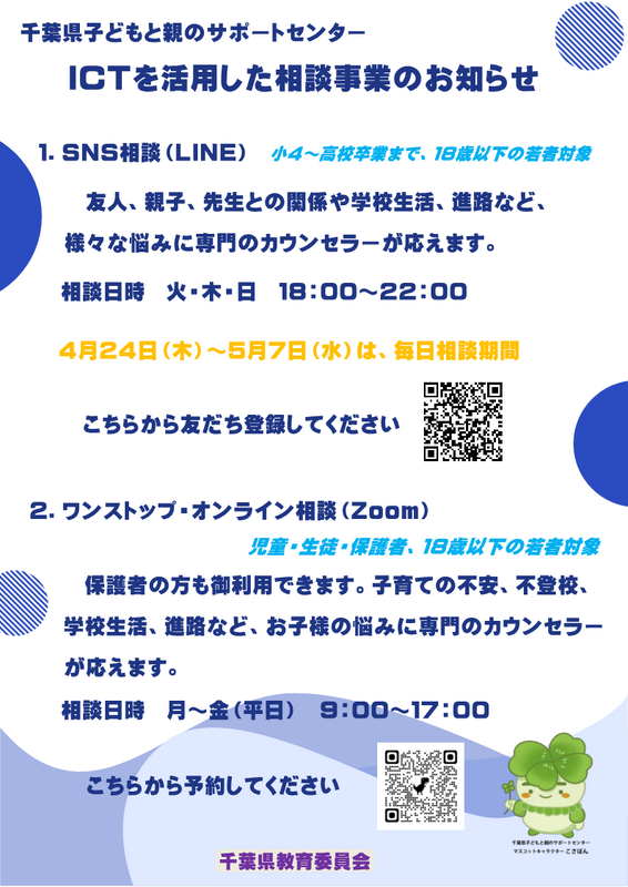 平素より,当センターの事業に御理解と御協力を賜り,御礼申し上げます。さて,当センターでは,昨年度よりICTを活用した相談事業の体制を強化し実施しております。特にSNS相談につきましては,ゴールデンウィークを迎えるにあたり,本年4月24日(木)から5月7日(水)までの14日間,毎日御相談いただける体制を整えました。これに伴い,児童・生徒及び保護者向けの啓発資料を作成しました。積極的な活用が図られるよう御配意願います。