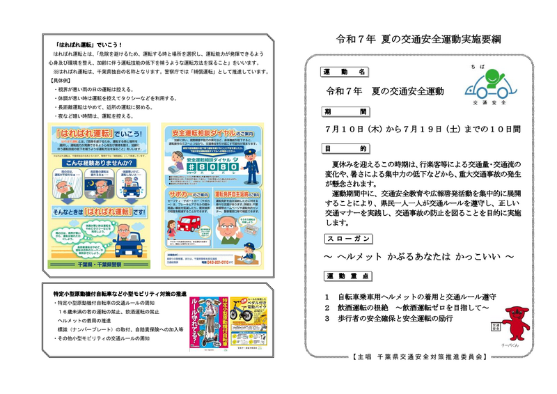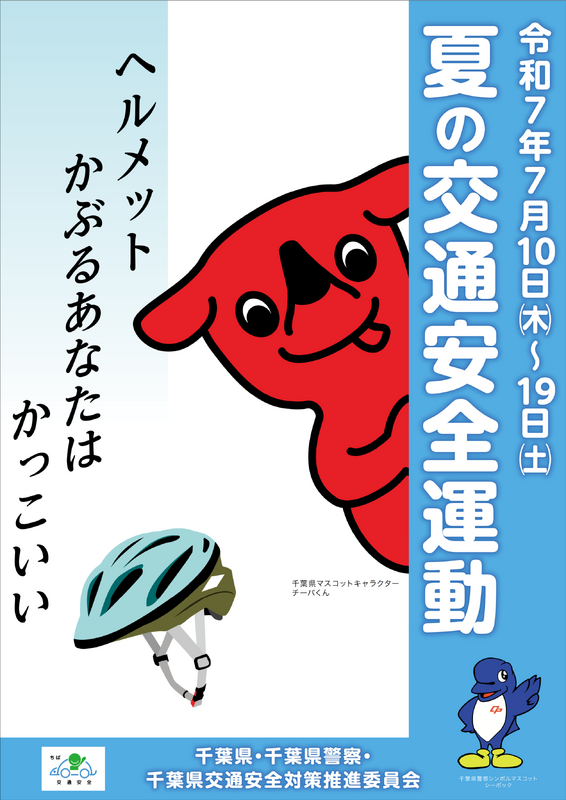 7月10日(木)から7月19日(土)までの10日間,令和7年『夏の交通安全運動』が実施されます。今回のスローガンは,「ヘルメット かぶるあなたは かっこいい」で,「自転車のヘルメット着用と交通ルール遵守」や「歩行者の安全確保」などが運動の重点になっています。