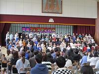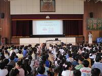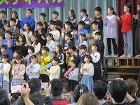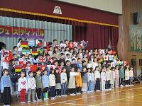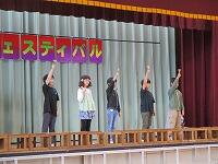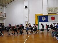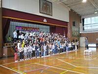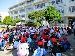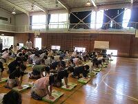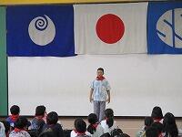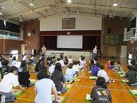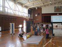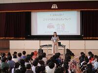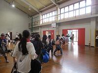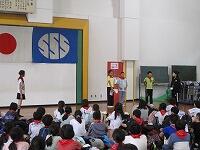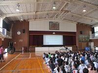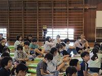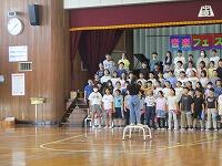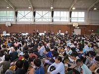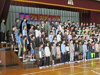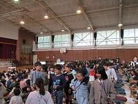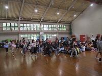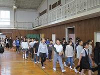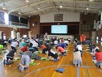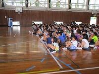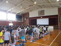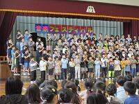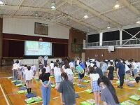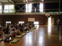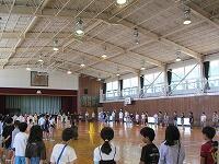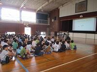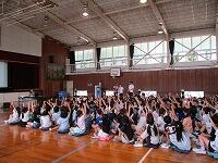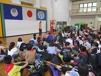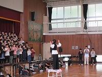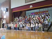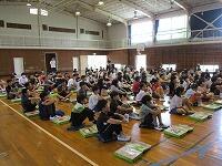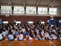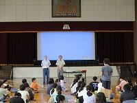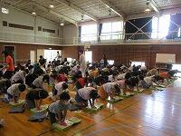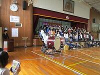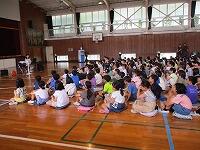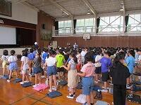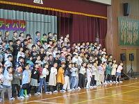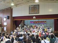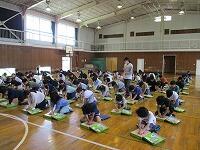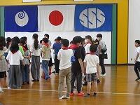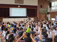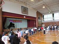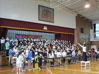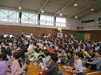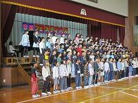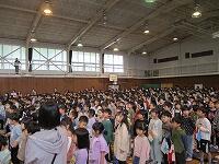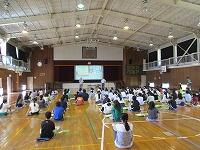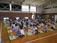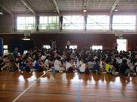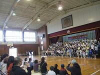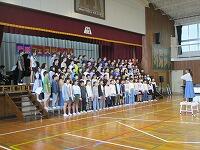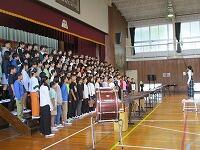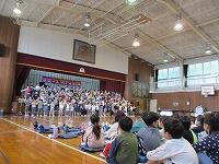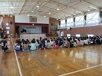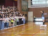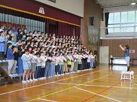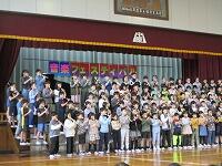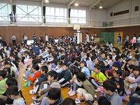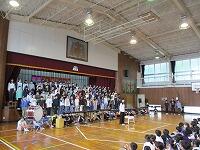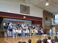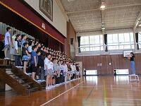 はじめに,体育館で「歓迎のあいさつ」と「歓迎のうた」を行いました。