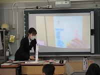 スライドで,「学校生活の様子」を紹介しました。「6年生との関わり」や「朝の支度」の様子です。