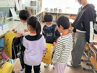 幼稚園生と話をしながら、次に行く場所を決め学校を案内しました。ランドセルを背負わせてあげたり、「図書室」で本の紹介をしたりして、交流しました。