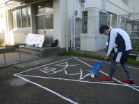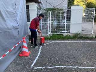 朝7時前、おやじの会のメンバーが続々と集まってきて、早速駐輪場の線引きを始めました。