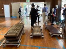 机やいすが、きれいに拭きあげられて、体育館に運び込まれていきました。