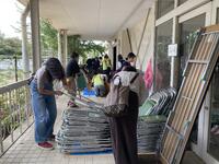 こちらは会場の椅子や机を体育館に戻すために、椅子の脚や机を雑巾で拭いています。