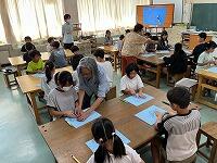 今日は,4年生が書写の毛筆の学習で「はす」の練習に取り組みました。「はす」は,平仮名なので,柔らかく丸みを持たせるように書くことが大事です。2文字とも,丸い窓のバランスに注意して書くようにします。