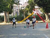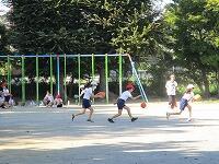 5年生が「ボール運動」で,ドリブルをしながらだんだん速く走っていく練習をしていました。