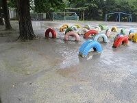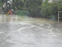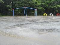 今日は,台風が接近しているので,雨がたくさん降っています。大雨になる前に,4年生が校庭の雨水の様子を観察しました。4年生は,理科で「雨水のゆくえ」を学習しています。雨水がどこへ行き,地面の様子とどのように関係しているかを学びます。