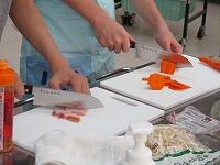 ニンジンの切り方に注意です。熱が均一に伝わるように,野菜ごとの大きさや形,厚みをそろえます。