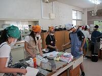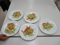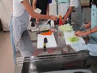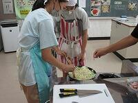 用具をそろえた後,野菜を洗います。ニンジン,キャベツ,ハムを切ります。