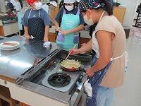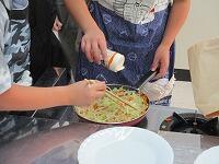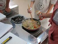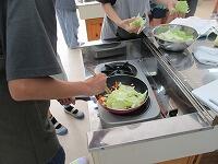 使った用具類を洗っています。野菜に火が通ったら,塩コショウで味つけます。