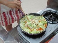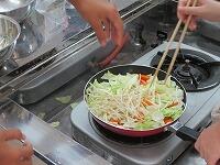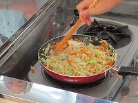 フライパンに油を差し,まず,ニンジンを炒めます。次に,キャベツ,ハム,もやしと入れて炒めていきます。