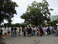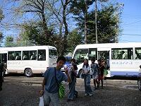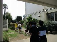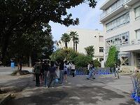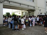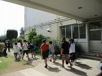 昇降口前のところに並びます。バスが来るところまで移動して,バスを待っています。