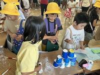 割りばしや紙コップ,風船など様々な種類の道具を使った「おもちゃ」がありました。