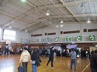 体育館の入口のところに,「あめでとう」と書かれたメッセージが掲示されています。