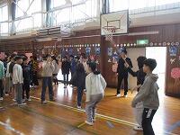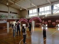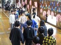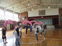 「花のアーチ」を立てて,最後の人が通り過ぎたら「アーチ」を下ろします。移動の仕方を振り返っています。