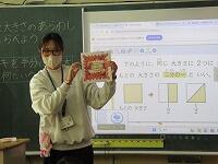 算数で,「分数」の学習をしていました。「二分の一」をケーキの描かれた紙を半分に折って考えていました。