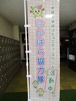 この度,「コミュニティ・スクール」の『のぼり旗』が完成しました。「なかはら協力隊」です。中原小学校内に設置されます。『のぼり旗』には,中原小の「創立記念マスコットキャラクター」の「なかりん」と「葉ッピー」が,そして,「ホタル」も描かれています。