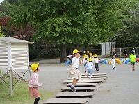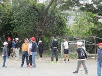 大きな棒を横に倒して,コーンを回りながら運びます。 part3へ続く