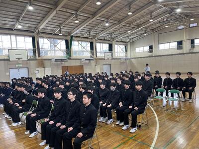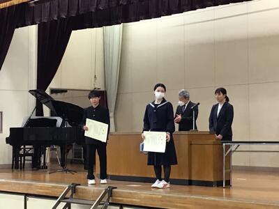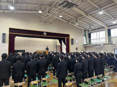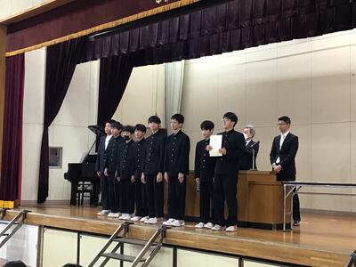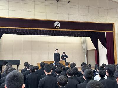 予行練習に続き、後期の表彰式を行いました。運動部の新人戦や1年生大会での好成績をはじめ、美術作品の入賞や作文コンテストなど、多分野にわたる生徒たちの活躍が紹介されました。文武両道に励む生徒たちの努力が、多くの形となって実を結んでいます。