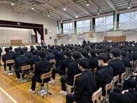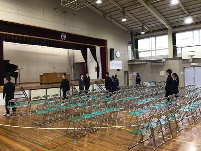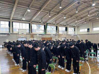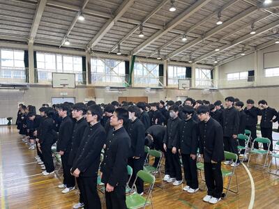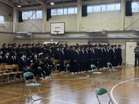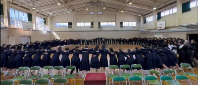 卒業式の予行練習を行いました。在校生は式典に臨む心構えを再確認し、会場は雨音が響くほどの静寂に包まれました。3年生もこれまでの練習の成果を十分に発揮しました。当日は3年間の集大成として、感謝の気持ちを込めて最高の式を迎えたいと思います。