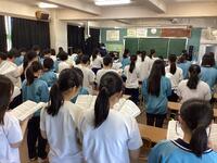 呼名、起立、一礼や着席のタイミングの練習。代表の生徒の動くタイミングやそれに合わせての一礼など、確認をしながら練習をしました。特に呼名練習は、左足と左手の動き、回れ右の仕方など、所作がきれいになるように確認をしました。歌の練習ではきれいなハーモニーになってきています。完成度は先週よりもアップ↑です。