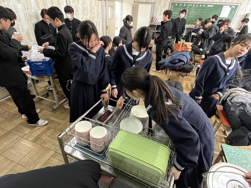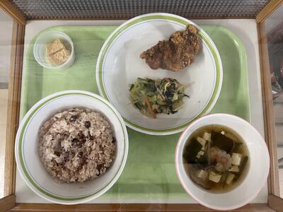 3月10日は中学校最後の給食でした。メニューは赤飯、鶏肉のから揚げ、磯香和え、澄まし汁(祝のなると入り)、わらび餅でした。給食室でお赤飯を炊き、3年生のリクエスト第一位の唐揚げで一足先にお祝いです。