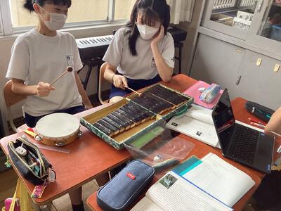 「同期しない音楽」とは何かをグループで考え、様々な楽器を使い「同期しない」の意味を模索していました。最後には自分たちの考えをまとめることができました。