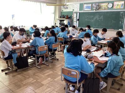 この5,6時間目は各学級の学級委員(男女1名ずつ)が司会・運営を行い、担任の先生も参観者の一部となっていました。3年生は見事に進めていき、1年生も初めての経験ながら、スムーズに生徒主体の2時間を過ごしました。