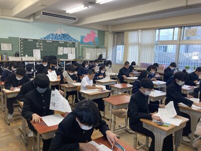 Smile学級では、1日目は、流山高等学園の過去問(国語・数学・理科・社会)を時間を計って解きました。