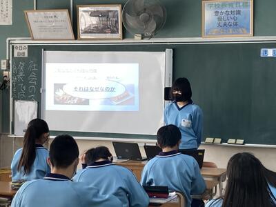 それぞれの学年で、宿泊研修、校外学習を通して、インターネットで調べて分かることでなく、「現地に行ったからこそ分かったこと、経験できたこと等」を伝える。というミッションのもと、各班がテーマを定めてプレゼンテーションを行います。