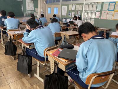 2人ペアで協力して問題を解いていきます。未だ受験していないクラスもあって問題内容は秘密ですが、簡単には解けない問題でとても面白いです。1・2年生の中で最も正答率が高いのはどのペアになるのか、気になります。