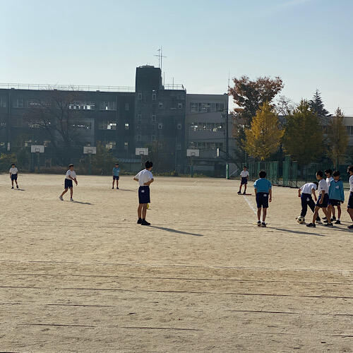 グランドでは3年生の男子がサッカーに取り組んでいます。ゴールが決まると歓声があがり、とても楽しそうです。