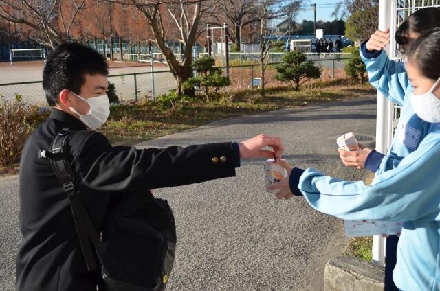 生徒会役員のみなさんが、赤い羽根募金の活動をしています。たくさんの生徒や先生方が協力をしてくれています。