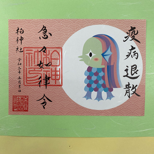 柏神社の御朱印が、疫病退散のシンボルとして話題のアマビエのものになっているとのことで、代わりにお参りをしてもらいました。新型コロナウイルスも早く退散してもらいたいものです。