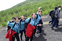 風穴駐車場から樹海散策コースに出発しました。天気も大きく崩れることもなく、氷穴に着く頃には晴れ間ものぞいていました。各クラスを2グループに分け、インストラクターに付いてもらい説明を聞きながら案内してもらいました。