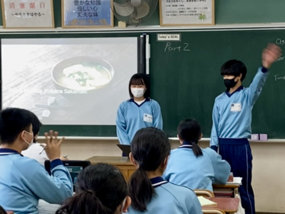3年生の授業の様子です。国語で和歌について調べ、スライドを用いて発表を行いました。
