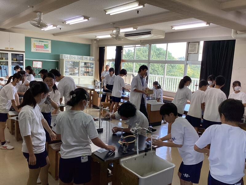 理科の授業では、理科室で水とエタノールの混合物を加熱する蒸留の実験を行いました。