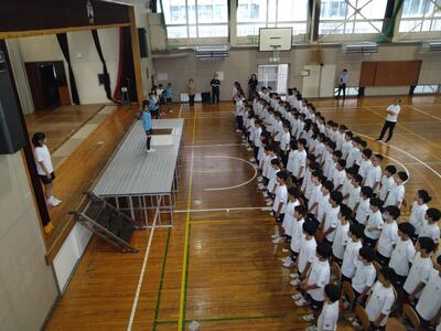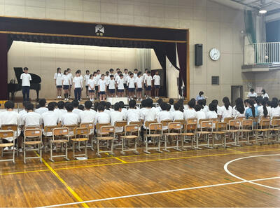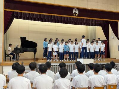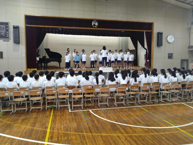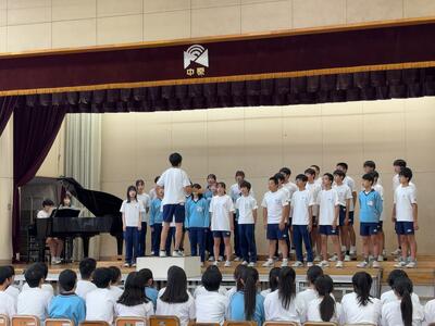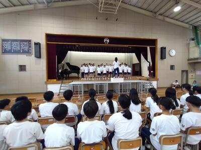 最初に学年合唱の隊形を確認し、その後、学級合唱の発表と動きの確認を行いました。