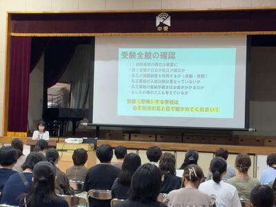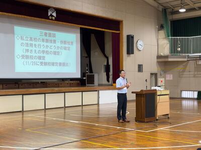 月末から行われる三者面談で話したいこと、確認したいことから、今後の進路決定の流れや留意点などについて話がありました。生徒自身の意思決定ももちろん大事ですが、ご家庭で意見を一致させることも大切です。進路について不確定な点が多い場合は、ぜひ早めに話し合いをしてみてください。