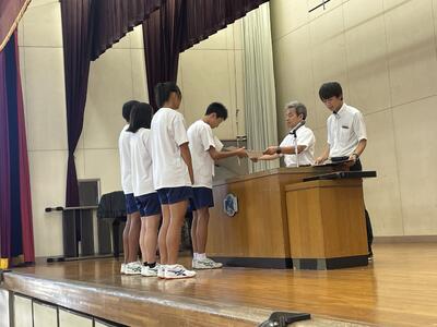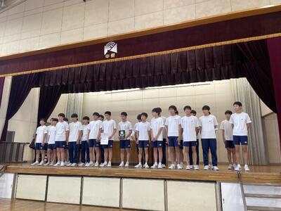表彰があったのは、男子バスケットボール部、オーケストラ部、特設水泳部、ソフトテニス部、陸上競技部であり、それぞれ壇上にあがりました。