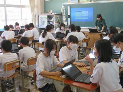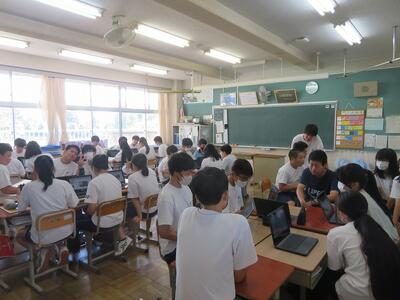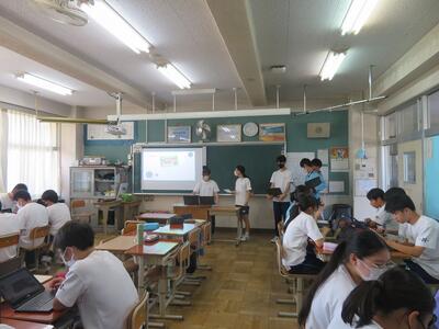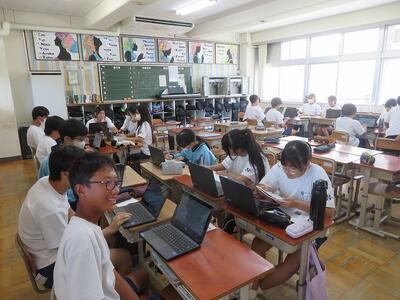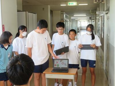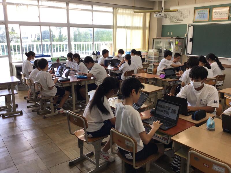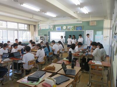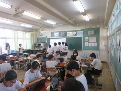 本日(9/5)6校時の総合の時間は,9月20日(金)の一日授業参観日の午後に行うプレゼン発表会に向けて,全クラスで取り組みました。各クラス班ごとの発表になりますが,旅行行事のプレゼンと各個人の自己紹介もあり一人一人が作成しています。今日は教室で班や個人で作成しながら,順番に班ごとに教室のプロジェクターを使ったり,廊下などに場所をかえて発表のリハーサルや練習に取り組んだり,各クラスで様々な工夫をしながら楽しそうに活動していました。